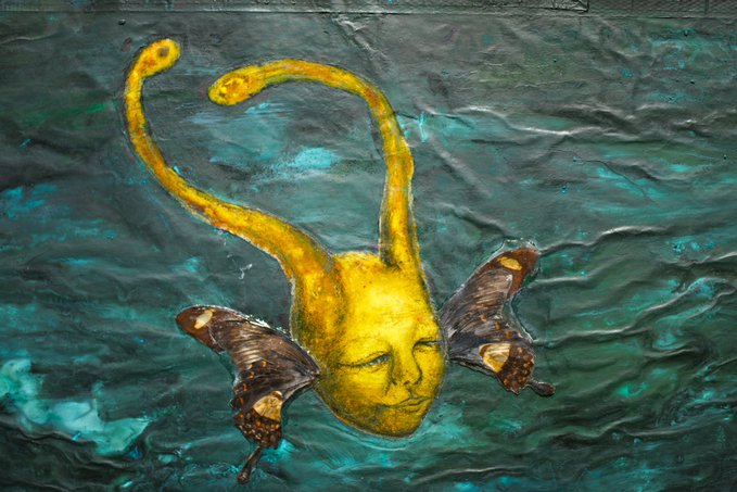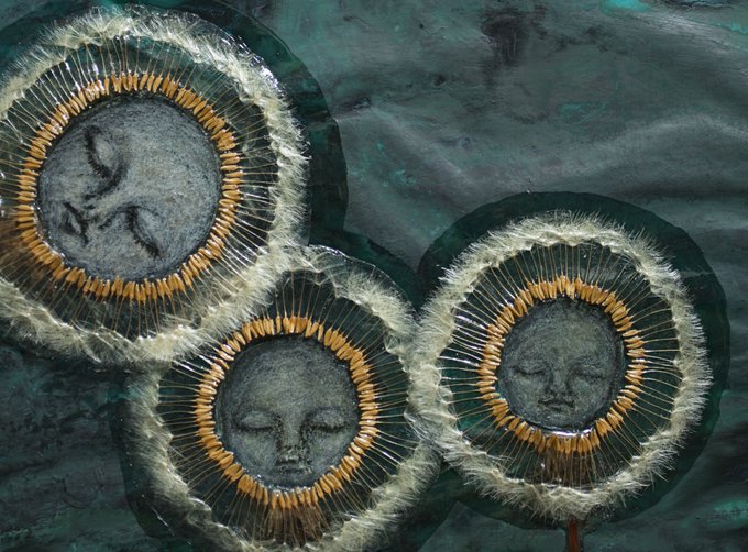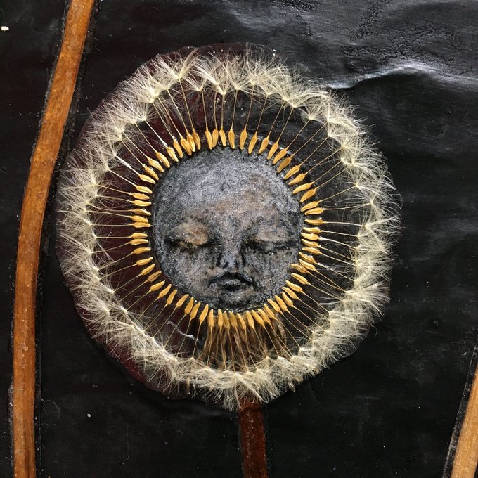 この絵は、本物のたんぽぽの綿毛や草、蝶のハネを使用したミクストメディア作品で、3年の月日を費やして完成させた渾身の一作です。